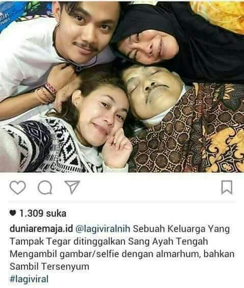 Wefie terakhir bersama jenazah ayah…iki kudu piye?. Dapat skrinsut sebuah foto keluarga entah beneran atau sebuah drama sinetron. Ditengah jenazah sang ayah dan ibu yang terisak menangis justru kedua anaknya senyum wefie kayak tiada sesuatu yang terjadi. Ini senyum terakhir bersama ayah … Mungkin dalam hatinya…