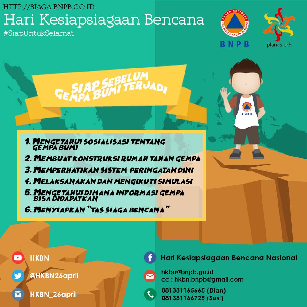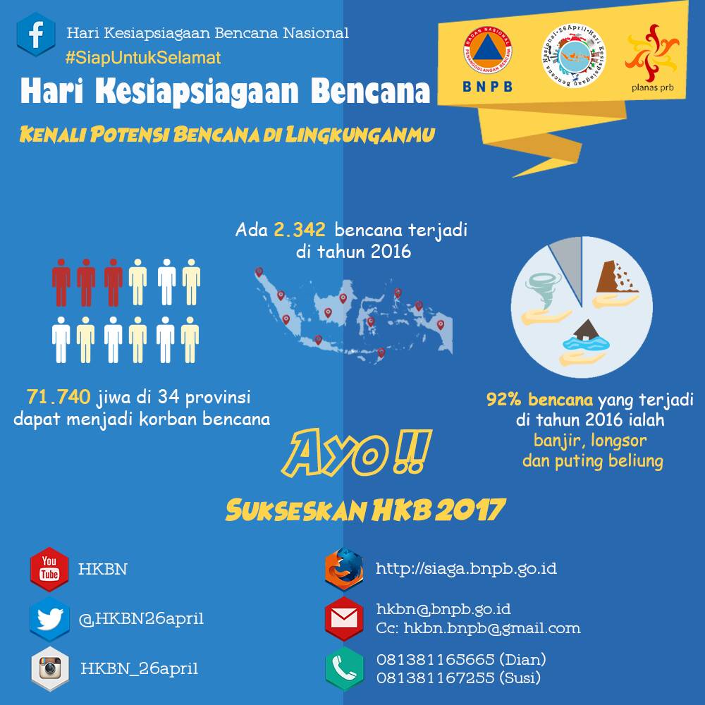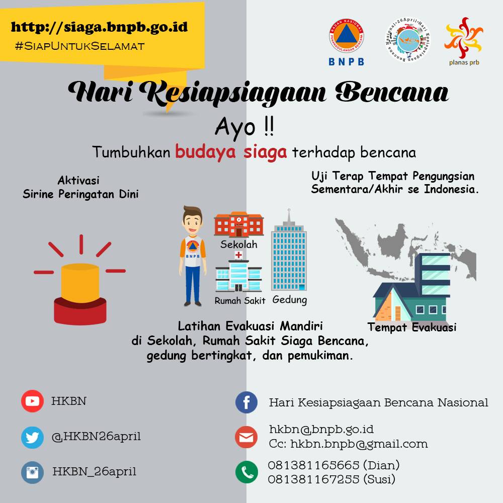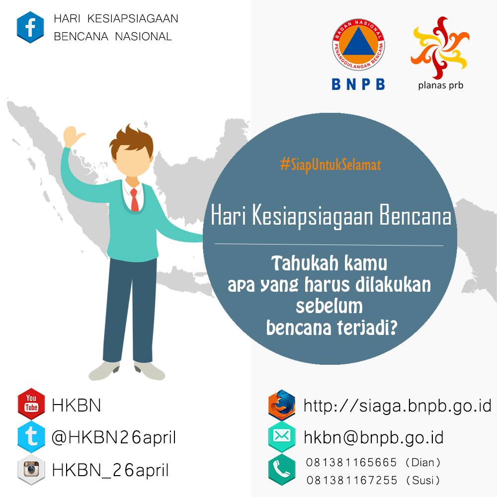 Yuuk sukseskan Hari Kesiapsiagaan Bencana Nasional (HKBN) tahun 2017. Tanggal 26 April diperingati sebagai Hari Kesiapsiagaan Bencana Nasional (HKBN) mantemans. Tanggal 26 April juga merupakan peringatan hari lahirnya Undang-Undang Penanggulangan Bencana No.24 tahun 2007. Yuuk sukseskan Hari Kesiapsiagaan Bencana Nasional (HKBN) tahun 2017.