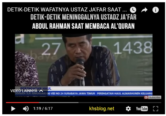 ” surga merupakan bagian orang soleh seperti qari Ustadz Jakfar Abdurrahman dari Pamekasan, Madura yang meninggal dunia saat melantunkan ayat suci Al Quran. Beliau meninggal, Senin, 24 April 2017 di Rumah Menteri Sosial Khofifah di Surabaya. Akhir perjalanan hidup yang demikian indah, Ustadz….”ujar akun facebook Pepih Nugraha.