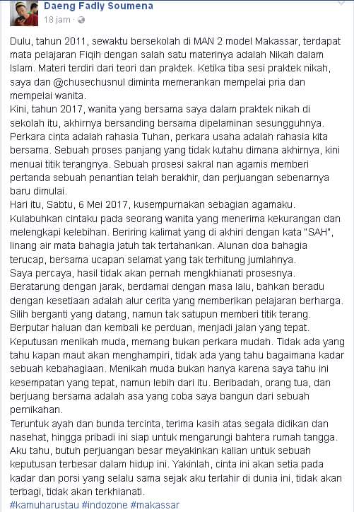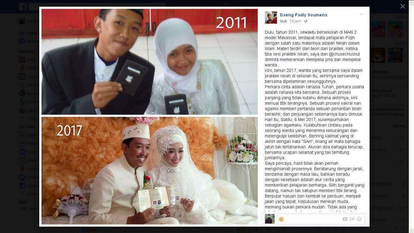 Ketika SMA jadi model praktek fiqh nikah, 6 tahun berselang nikah beneran ini ada di Makasar. Pria yang bernama Daeng Fadly Soumena ini menjadi buah bibir ketika status facebooknya mengabarkan pernikahannya dengan gadis teman SMA nya. Uniknya istrinya ini merupakan model yang pernah menjadi pasangan ketika pelajaran fiqh nikah. Weleh-weleh, praktek nya tahun 2011 tapi nikah benerannya tahun 2017. Mongggo disimak mantemans.