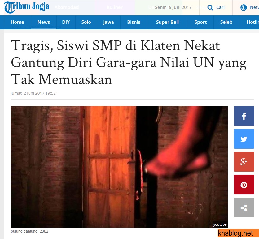 Dimarahi ortu karena nilai unas, siswi SMPN 2 Manisrenggo ini nekat gantung diri. BDH (15) warga Dukuh Tegalsono, Desa Kebondalem Lor, Kecamatan Prambanan, Klaten gantung diri di dapur rumahnya. Hal ini diduga merasa tertekan dengan nilai unas yang tidak sesuai harapan orang tua. Siswi SMPN 2 Manisrenggo Klaten tega mengakhiri hidupnya pada hari Jum’at, 02 Juni 2017.