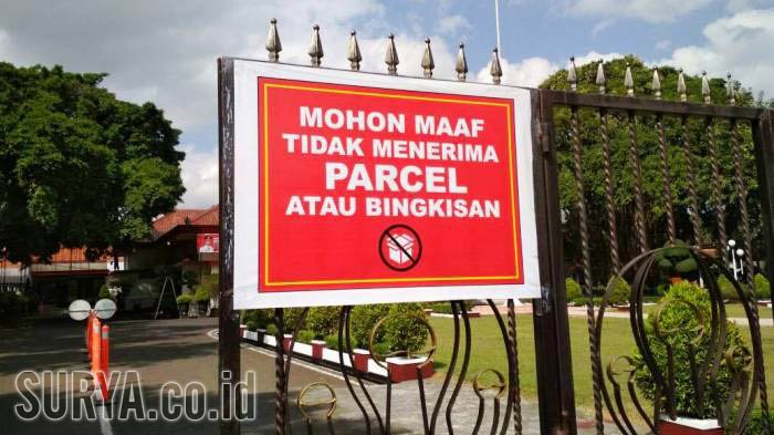 Kerenn…Hindari gratifikasi Bupati Trenggalek ini pasang larangan terima parcel di pintu Pendopo. Bupati Trenggalek Emil Elestianto Dardak membuat tulisan unik di pintu garasi pendopo Kabupaten Trenggalek. “Mohon maaf tidak menerima parcel atau bingkisan,” begitu tulisan warna putih dengan latar belakang warna merah tersebut. Apa maksudnya papan peringatan ini?