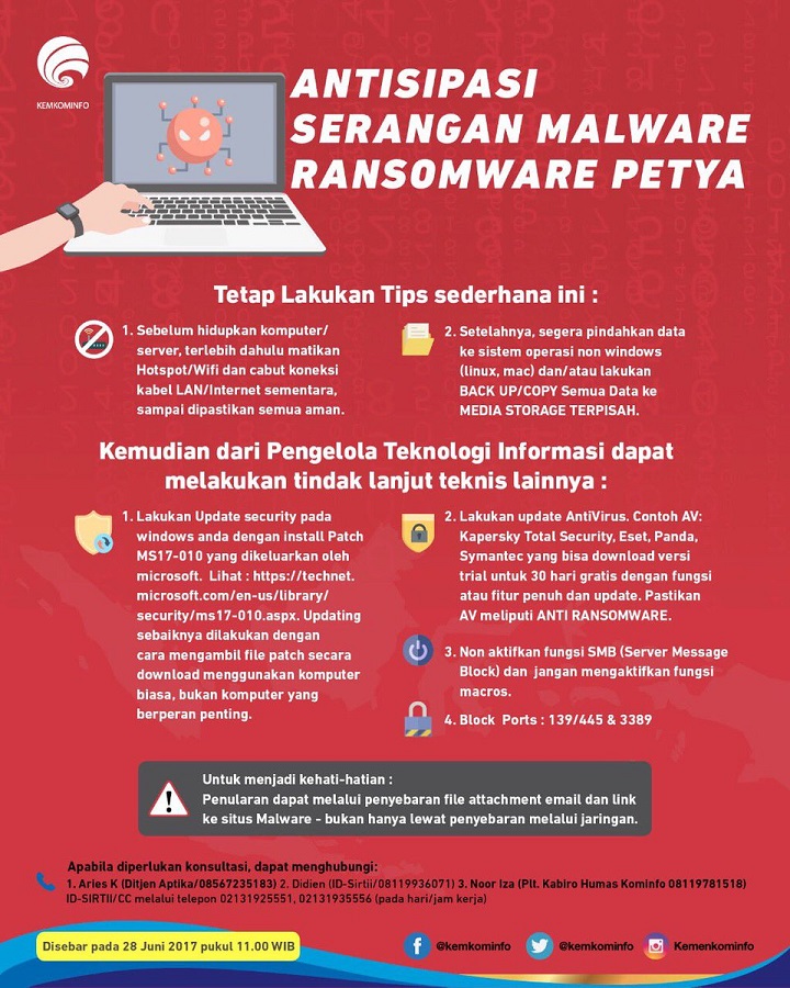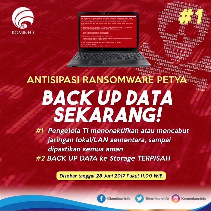 Sementara Siaran Pers via laman web https://www.kominfo.go.id/, Menteri Komunikasi dan Informatika Rudiantara meminta masyakarat yang memiliki komputer melakukan antisipasi serangan PETYA, sebelum mengaktifkan komputernya, agar melakukan : BACKUP DATA SEKARANG.