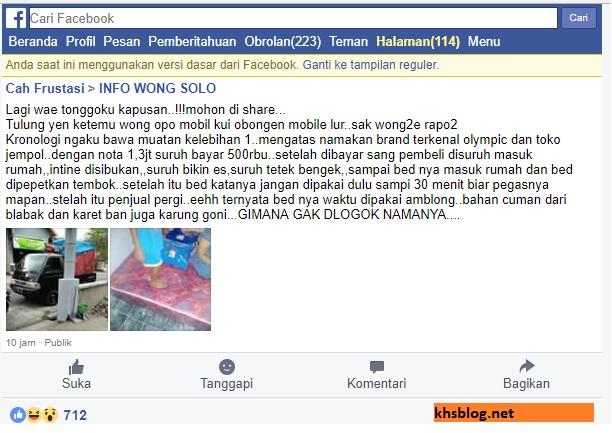 “Kronologi ngaku bawa muatan kelebihan 1..mengatas namakan brand terkenal olympic dan toko jempol..dengan nota 1,3jt suruh bayar 500rbu..setelah dibayar sang pembeli disuruh masuk rumah,,intine disibukan,,suruh bikin es,suruh tetek bengek,,sampai bed nya masuk rumah dan bed dipepetkan tembok..setelah itu bed katanya jangan dipakai dulu sampi 30 menit biar pegasnya mapan..stelah itu penjual pergi..eehh ternyata bed nya waktu dipakai amblong..bahan cuman dari blabak dan karet ban juga karung goni…GIMANA GAK DLOGOK NAMANYA....” tambahnya