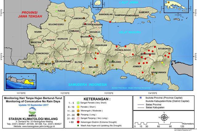 Sementara itu mengutip suarasurabaya.net (11/09/2017), Stasiun Klimatologi Malang di Karang Ploso telah merilis hasil monitoring hari tanpa hujan di Wilayah Jawa Timur. Sedikitnya, 8 daerah di Jatim telah memasuki kekeringan ekstrem karena mengalami hari tanpa hujan sangat panjag (31 sampai 60 hari).