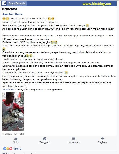 Pengorbanan sang Ayah untuk anaknya yang ngambek gak sekolah karena gadget android. Sebuah kisah inspiratif dibagikan oleh warganet di facebook bernama Agustina Doise yang berjudul 😥😥<KISAH SEDIH SEORANG AYAH>😥😥. Kisah ini sebenarnya diposting pada 31 Juli 2017 silam dengan tanggapan warganet hingga 150k. Sekilas sang bapak rela menabung uang Rp.2.000 untuk mewujudkan mimpi anaknya yang ngambek tidak mau sekolah. Monggo disimak brosis…