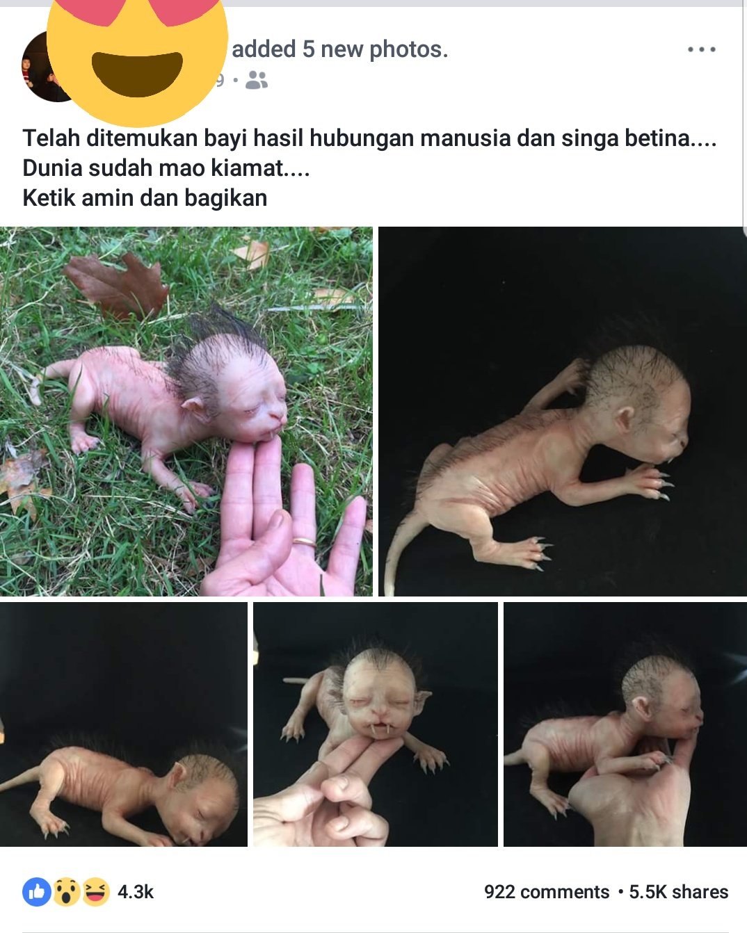 Heboh Tersebar Foto Bayi Manusia dengan Singa Betina…eh ternyata beneran hoax…xixixixi. Sebuah foto tersebar secara viral mengenai bayi yang sekilas berbentuk singa dengan kuku-kuku yang tajam. Foto tersebut diberi kepsyen,”Telah ditemukan bayi hasil hubungan manusia dan singa betina. Dunia sudah mao kiamat. Ketik Amin dan Bagikan ” ujar akun tersebut. Foto tersebut telah dibagikan hingga 5k brosis. Harap dipahami bahwa itu foto cuma boneka kawans….hehehe.