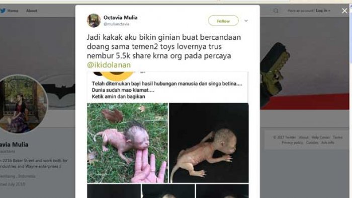 Akun twitter @Mulia Octavia memberikan klarifikasi mengenai foto yang sedang viral tersebut. Bahwa itu hanya bayi boneka yang dibuat oleh komunitas pencinta mainan. “Jadi kakak aku bikin ginian buat bercandaan doang sama temen2 toys lovernya trus nembur 5.5k share krna org pada percaya @ikidolanan ” ujar Octavia Mulia @muliaoctavia pada hari Selasa, 11 Oktober 2017. Lebih lanjut ia menjelaskan, Maksud ak yg bikinan kakak ku itu postnya..mainannya bikinan orang custom made silicone toys. ” pungkasnya