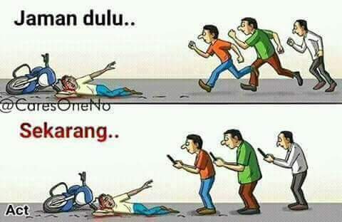Kalau dahulu ada musibah kecelakaan maka orang-orang akan segera berdatangan untuk memberikan pertolongan. Namun kini mereka khususnya generasi milenial juga ramai berdatangan namun bukan dalam rangka untuk memberikan pertolongan pertama namun lebih mendokumentasikan kegiatan. Serba dilemah juga namun begitoelah adanya di sekitar kita. Tidak salah memang mendokumentasikan sebuah kejadian namun semoga tidak sebatas itu saja.