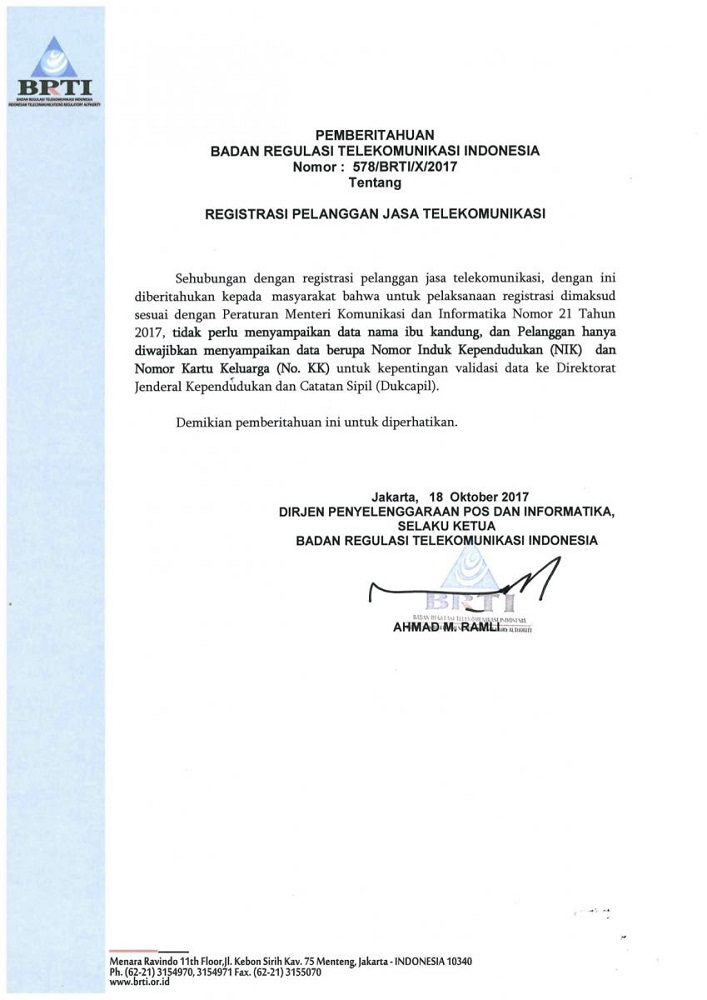 Menunjuk Peraturan Menkominfo No 21 Tahun 2017 tentang Perubahan Kedua atas Peraturan Menkominfo No. 12 Tahun 2016 tentang Registrasi Pelanggan Jasa Telekomunikasi, bersama ini disampaikan bahwa dengan mempertimbangkan perlindungan terhadap informasi yang bersifat pribadi dan dalam rangka memberikan rasa keamanan dan kenyamanan bagi masyarakat maka :