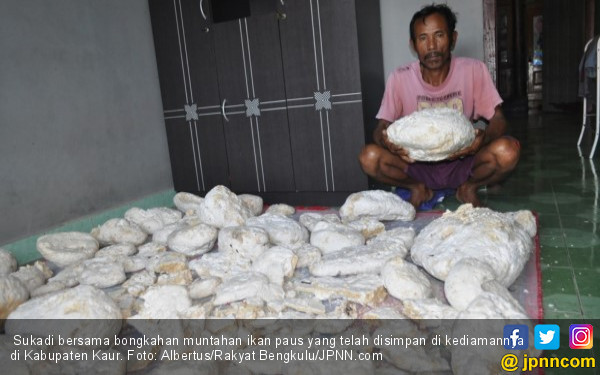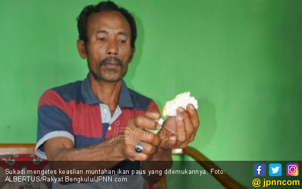Muntahan ikan paus itu ditemukan Sukadi terapung di laut sekitar Pulau Enggano, Bengkulu Utara, 2 November lalu. Kemudian setelah ditaruh pulau lalu dibawanya pulang ke Kaur. Sampai 9 November, muntahan paus seberat 150 kg telah ada yang menawarnya Rp 3,3 miliar atau per kilonya Rp 22 juta. Namun dia berharap ada yang mau menawar 30 jeti untuk setiap kilonya.