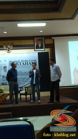 Pak DI pun langsung mendaulat dua kubu tersebut untuk maju kedepan saling berada argumen. KHS mencoba mewakili kubu yang percaya bahwa koran cetak akan mati. “Melihat fenomena zaman butuh info secara cepat dimana tinggal akses lewat gawai dan berita-berita mengenai koran diluar negeri yang berguguran alias kolaps, maka saya termasuk percaya bahwa koran cetak akan mati secara perlahan di negeri ini ”ujar KHS dengan penuh bimbang akan nasib koran cetak ini. “Kecuali ada inovasi dan terobosan khususnya regenerasi di kalangan pembaca “ ujar KHS yang mencoba memberikan persyaratan bahwa koran akan bisa bertahan. Pak DI pun memberikan apresiasi kedua belah pihak baik yang pro maupun kontra. “saya bersyukur ternyata kursi yang percaya bahwa koran akan bertahan semakin banyak”ujar pria berkacamata ini yang disambut dengan tepukan tangan kubu kursi kanan..hehehe.