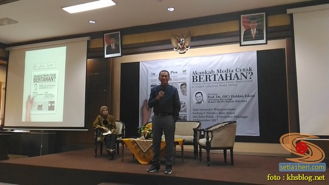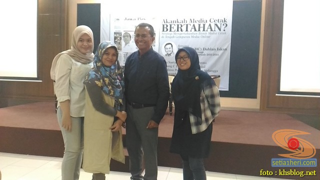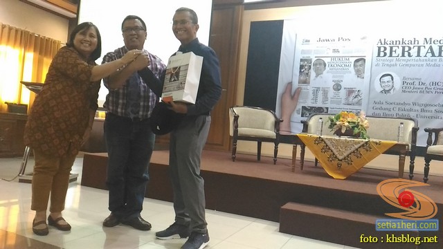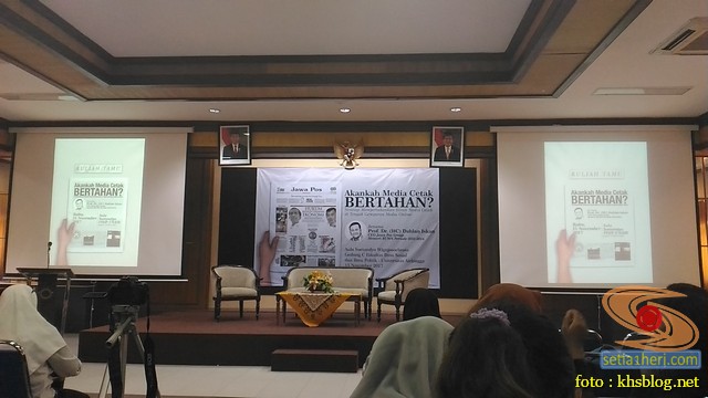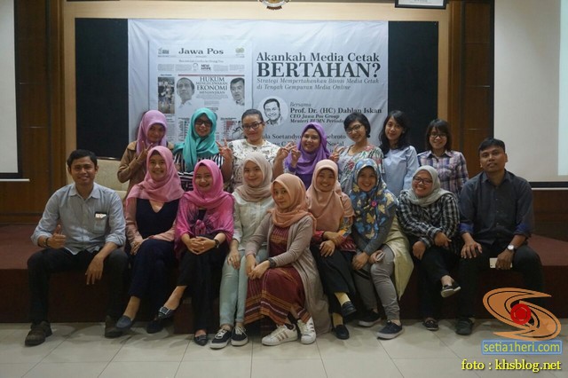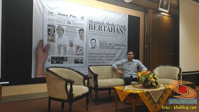 Acara kuliah tamu ini dipandu oleh Titik Puji Rahayu, S.Sos., M.Comms. PhD,. Menariknya para mahasiswa yang hadir dibagi langsung oleh Prof.Dr. (HC) Dahlan Iskan menjadi 2 kubu. Yakni kursi peserta sebelah kanan pak Dahlan diperuntukkan bagi mereka yang percaya koran akan bertahan alias tetap hidup. Sementara kursi disebelah kiri untuk mereka yang percaya bahwa koran akan mati. Jujur, KHS berada di kursi disebelah kiri yang percaya melihat beberapa fenomena bahwa koran cetak akan mati dibunuh oleh digitalisasi dan online media. Menariknya lagi, dari kursi yang ada ternyata masih banyak mahasiswa yang percaya bahwa koran akan bertahan…wkwkwkwkwk.