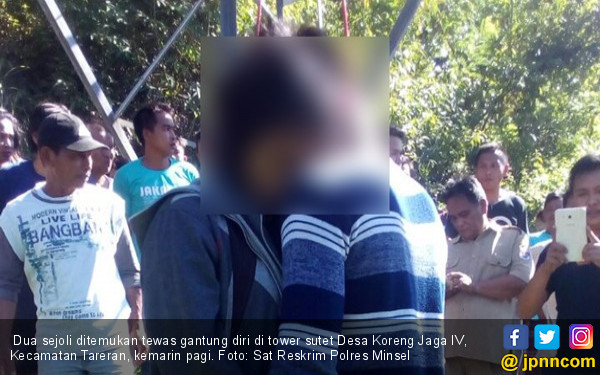Cinta tak direstui, 2 sejoli asal Sulawesi Utara nekat gantung diri berhadapan. Dua sejoli yakni Rino Zaferius Karwur (20) dan Meifa Karwur (13), nekat mengakhiri hidupnya dengan cara gantung diri di Tower Sutet Desa Koreng Jaga IV, Kecamatan Tareran, Minahasa Selatan, Sulawesi Utara pada hari Selasa (5/12) pagi sekira pukul 07.30 wita. Mereka ditemukan oleh ortu di pagi hari sudah tak bernyawa lagi.
