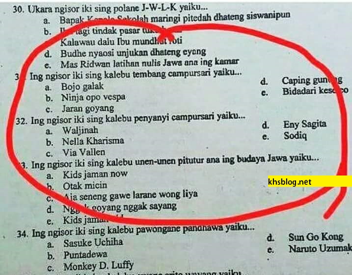 Wow…Nella kharisma dan Via Vallen masuk soal ujian basa jawa…ahihihi. Siapa yang tidak kenal 2 penyanyi dangdut yang lagi naik daun tersebut. Namanya pun menjadi pilihan jawaban ujian di dalam ujian bahasa jawa masbrow. Nella kharisma dan Via Vallen harus bersaing dengan Waljinah, Eny Sagita dan Sodiq untuk menjawab pertanyaan, “Ing ngisor iki sing kalebu penyanyi campursari yaiku? “dalam pertanyaan nomor 32…hehehe. Monggo disimak