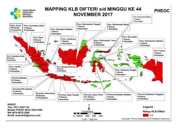 Data Kementerian Kesehatan menunjukkan bahwa sampai dengan November 2017, ada 95 Kab/kota dari 20 provinsi melaporkan kasus Difteri. Sementara pada kurun waktu Oktober – November 2017 ada 11 provinsi yang melaporkan terjadinya KLB Difteri di wilayah kabupaten/kota-nya, yaitu 1) Sumatera Barat, 2) Jawa Tengah, 3) Aceh, 4) Sumatera Selatan, 5) Sulawesi Selatan, 6) Kalimantan Timur, 7) Riau, 8) Banten, 9) DKI Jakarta, 10) Jawa Barat, dan 11) Jawa Timur.
