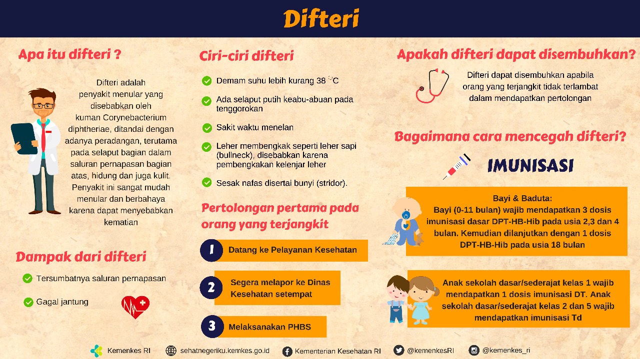 Yuuk cegah difteri dengan imunisasi efektif brosis. Difteri merupakan penyakit yang sangat menular. Penyakit ini disebabkan oleh kuman Corynebacterium diptheriae. Difteri adalah penyakit langka dimana terjadi infeksi serius pada hidung dan tenggorokan yang mudah dicegah dengan vaksin.Kebanyakan penyakit tersebut dialami oleh anak-anak yang belum mendapatkan vaksin difteri. Yuuk kenali gejala dan cara cegah difteri brosis..