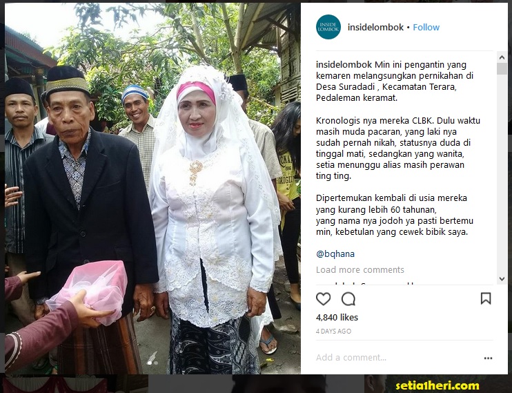 Dilansir oleh akun instagram @insidelombok pada tanggal 11 Januari 2017. Kedua mempelai dahulu pernah menjadi sepasang kekasih namun dalam perjalanannya sang lelaki menikah dengan wanita lain. Sementara wanita yang belum diketahui namanya ini sabar menunggu hingga usia tak lagi muda. Hari ganti tahun hingga sang lelaki menjadi duda karena ditinggal mati oleh sang itri. Dan bermula lah kisah CLBK dua insan yang sudah berada diusia senja ini. Selengkapnya berikut kisah haru dengan tagline, “Kutunggu Dudamu” ini.