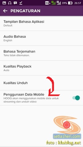 - Dari menu HOOQ pilihlah tab pengaturan. Pastikan menu “Penggunaan Data Mobile” dalam posisi ON alias aktif. KHS sempat mencoba menonaktifkan maka otomatis kuota internet utama berkurang.