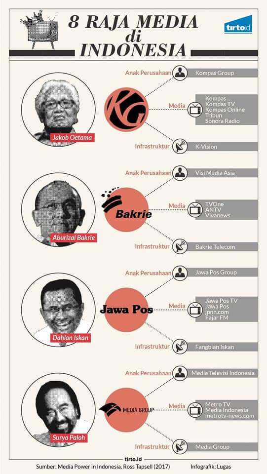 Daftar 8 Raja Media di Indonesia. Media di Indonesia seperti TV, koran, portal dan TV langgar ternyata dimiliki oleh beberapa orang ini. Mantemans tentu paham dengan TV Swasta yang ternyata beberapa dimiliki 1 orang saja. Penasaran dengan 8 orang raja media di Indonesia? Monggo disimak…