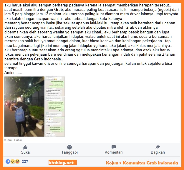 Kisah sedih driver ojek online, sudah diputus mitra eh diputus pula ‘calon’ cinta nya. Driver ojek Online juga manusia yang kadang baper dan terbawa ‘rasa’ pada pelangganya. Namun ‘rasa’ bertepuk sebelah mata dan meninggalkan luka disaat yang sama sedang terputus kontraknya. Demikian sebuah kisah sedih yang dialami oleh akun Kojun yang diposting dilaman grup Facebook Komunitas Grab Indonesia pada tanggal 1 April 2018 ini. Monggo disimak brosis…