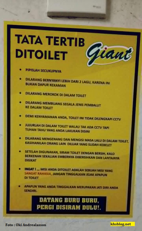 Gimana brosis? ada komeng dengan tata tertib ketika berada di Toilet Giant diatas. KHS sih kantornya deket Giant tapi lom pernah jumpai tempelan gokil diatas….xixixixi
