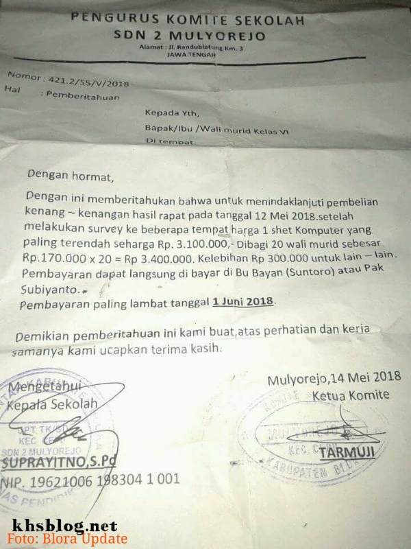Lulus SD diminta sumbang komputer sekolah sebagai kenangan, pemerasan kah?.Seorang warganet di Blora Update mencurahkah isi hatinya terkait anaknya yang lulus SD. Dalam sebuah surat edaran yang dibuat komite sekolah disebutkan bahwa setiap anak yang lulus diwajibkan menyumbang urunan untuk pengadaan komputer sekolah sebagai buah kenang-kenangan. Apakah ini bentuk pemerasan?
