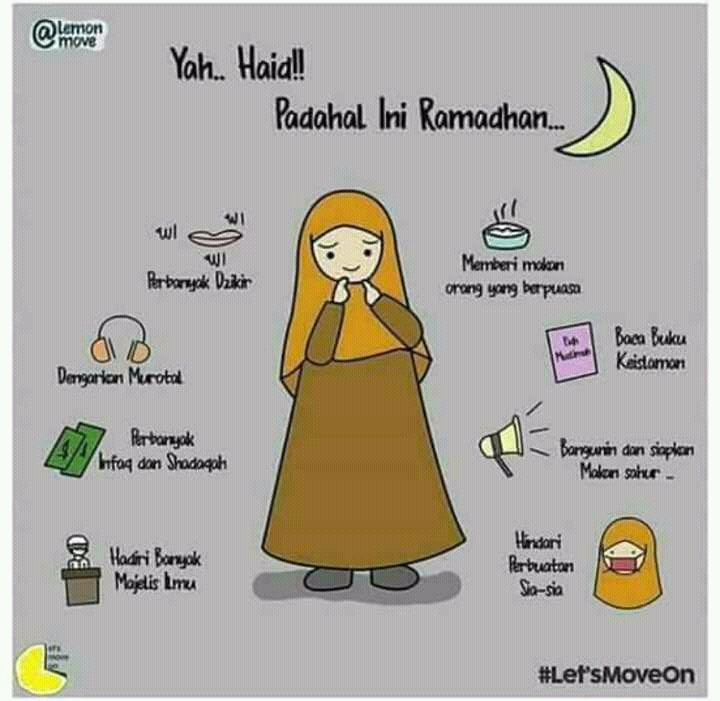 Aktivitas muslimah kala haid di bulan Ramadhan. Move On Yukkk Meski Haid di Ramadhan.Bagi para muslimah yang lagi kedatangan tamu bulanannya tak perlu galau apabila di sepuluh hari terakhir ramadhan belum bisa memaksimalkan amal-amal unggulannya. Belum bisa ikut i’tikaf di masjid sesuai dengan rencanya bersama keluarga tercinta. Masih ada amalan yang bisa dilakukan lho.