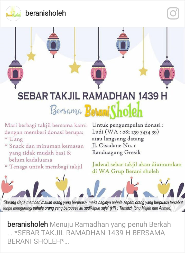 Nah, kawan pembaca blog bagaimana anda tertarik untuk bergabung dan menjadi bagian dari komunitas yang kece badai ini. Atau ingin sekedar mengintip update informasi komunitas ini. Bisa juga apabila ingin mendonasikan dananya silahkan klik beranisholeh di instagram untuk informasi lebih lanjut. (NRA)