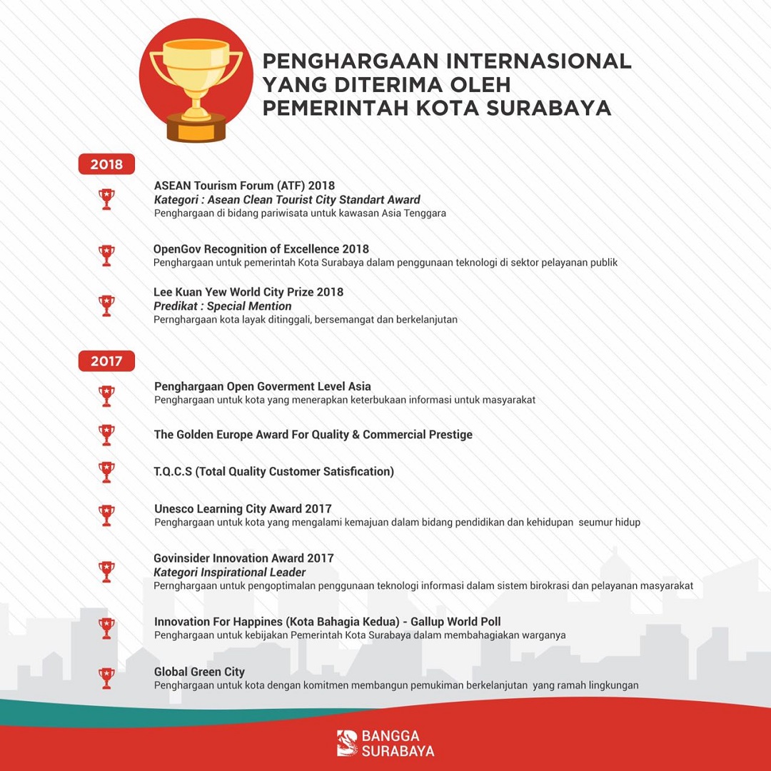 Mengutip akun twitter humas pemkot Surabaya @BanggaSurabaya pada 10 Juli 2018 merilis beragam penghargaan Internasional yang diterima Pemerintah Kota Surabaya tahun 2017-2018. Monggo disimak gans…