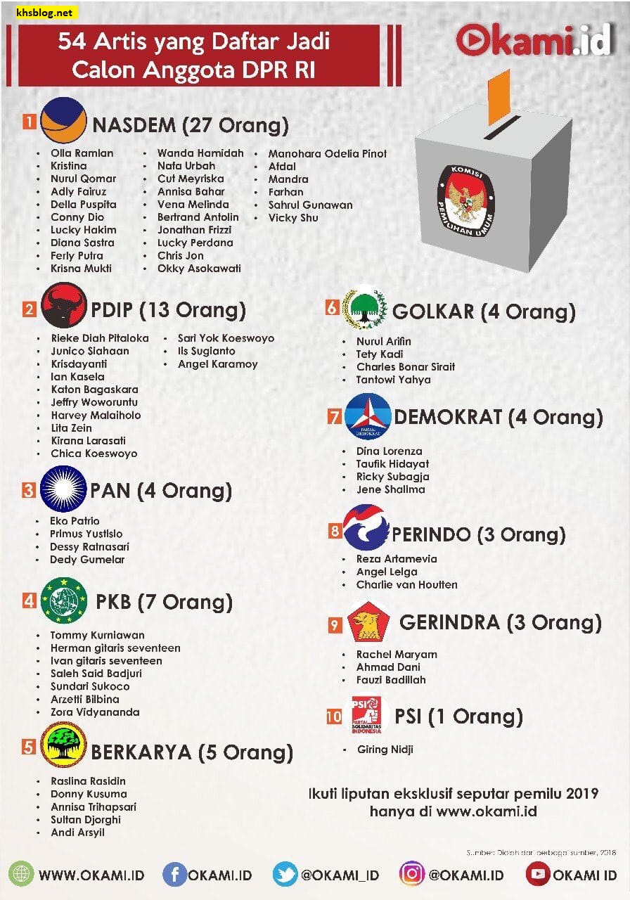 Daftar Lengkap Artis Jadi Caleg pada Pemilu 2019. Pendaftaran bakal calon legislatif (bacaleg) pada Pemilihan Legislatif (Pileg) 2019 usai ditutup pertengahan Juli 2018 kemarin. Dari data yang ada setidaknya terdapat 54 artis di tanah air yang mencoba peruntungan di dunia politik dengan mendaftar menjadi calon anggota legislatif. Mungkin mantemans sudah pernah dengan anggota DPR RI dari kalangan artis seperti Eko patrio (PAN) atau Rieke Diah Pitaloka (PDIP). Nah kini terdapat artis-artis lain yang menyusul jejak mereka. Monggo disimak gans….