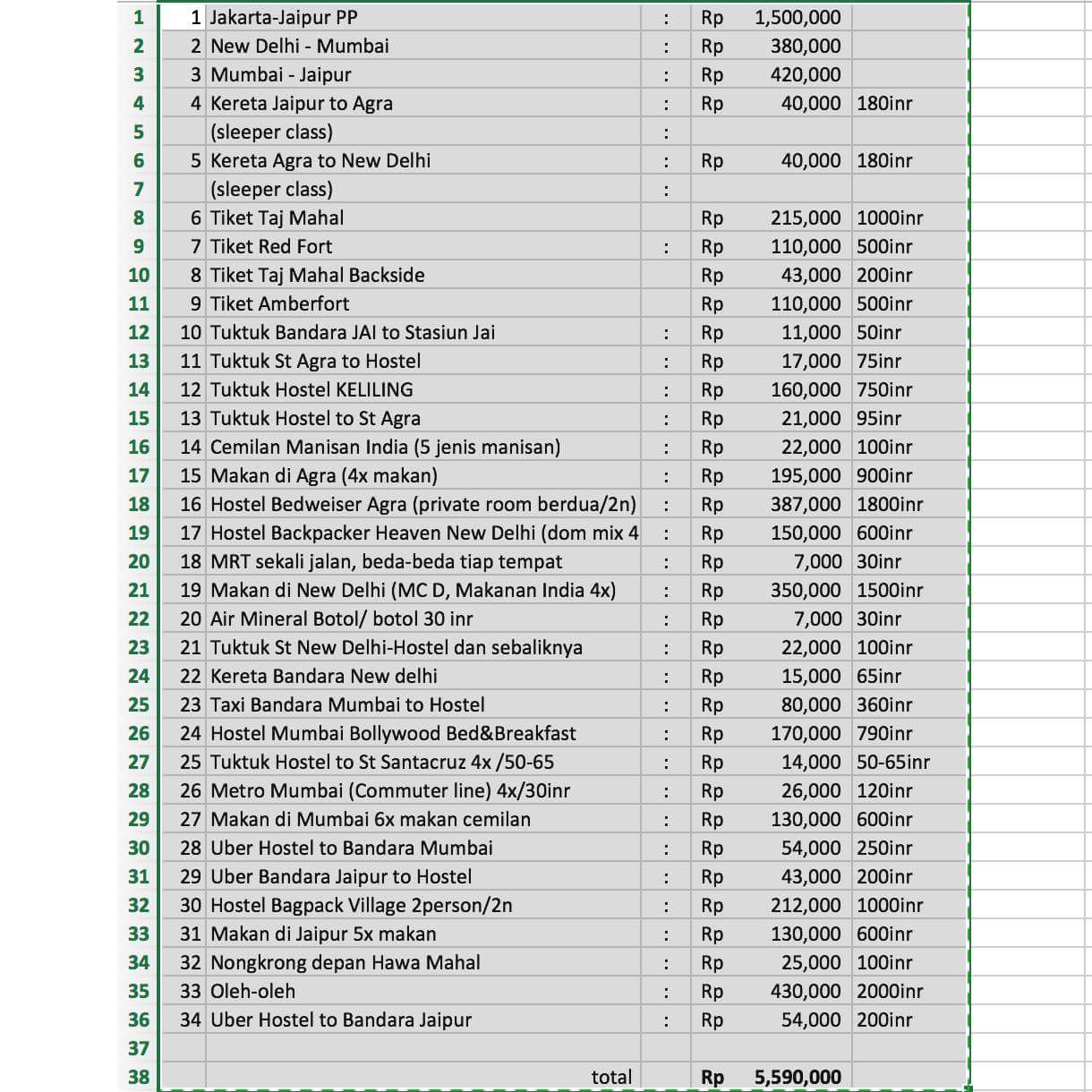 Bermula dari bulan April, ada penerbangan yang ngasih promo gak tanggung-tanggung murahnya dan mendapatkan tiket PP Jakarta-Jaipur PP cuma 1.5 Juta rupiah dan saya pun memilih terbang di awal Juli. sebenernya udah nungguin promo dari bulan Januari karena mau dateng ke India pas hari Holy (bulan April) tapi ya apaboleh buat, dewi fortune datang dibulan Juli. Oiya saya juga sudah pesan tiket dan lagi-lagi dapet tiket murah penerbangan dari New Delhi-Mumbai-Mumbai-Jaipur dengan total 850an. Saya pergi berdua dengan teman saya dan kita cukup puas karena menclok dibeberapa kota di India. 10 hari kita bisa ke Jaipur-Agra-New Delhi-Mumbai-Jaipur. Wow sangat menclok-menclok ya. Masih mupeng buat cuss ke Leh Laddakh, tapi karna jatah cuti pun terbatas cukup itu dulu aja explorenya. Kaya gimana perjalanan kita selama sepuluh hari dengan total uang 5 juta ALL IN ? ini dia itinerarynya :