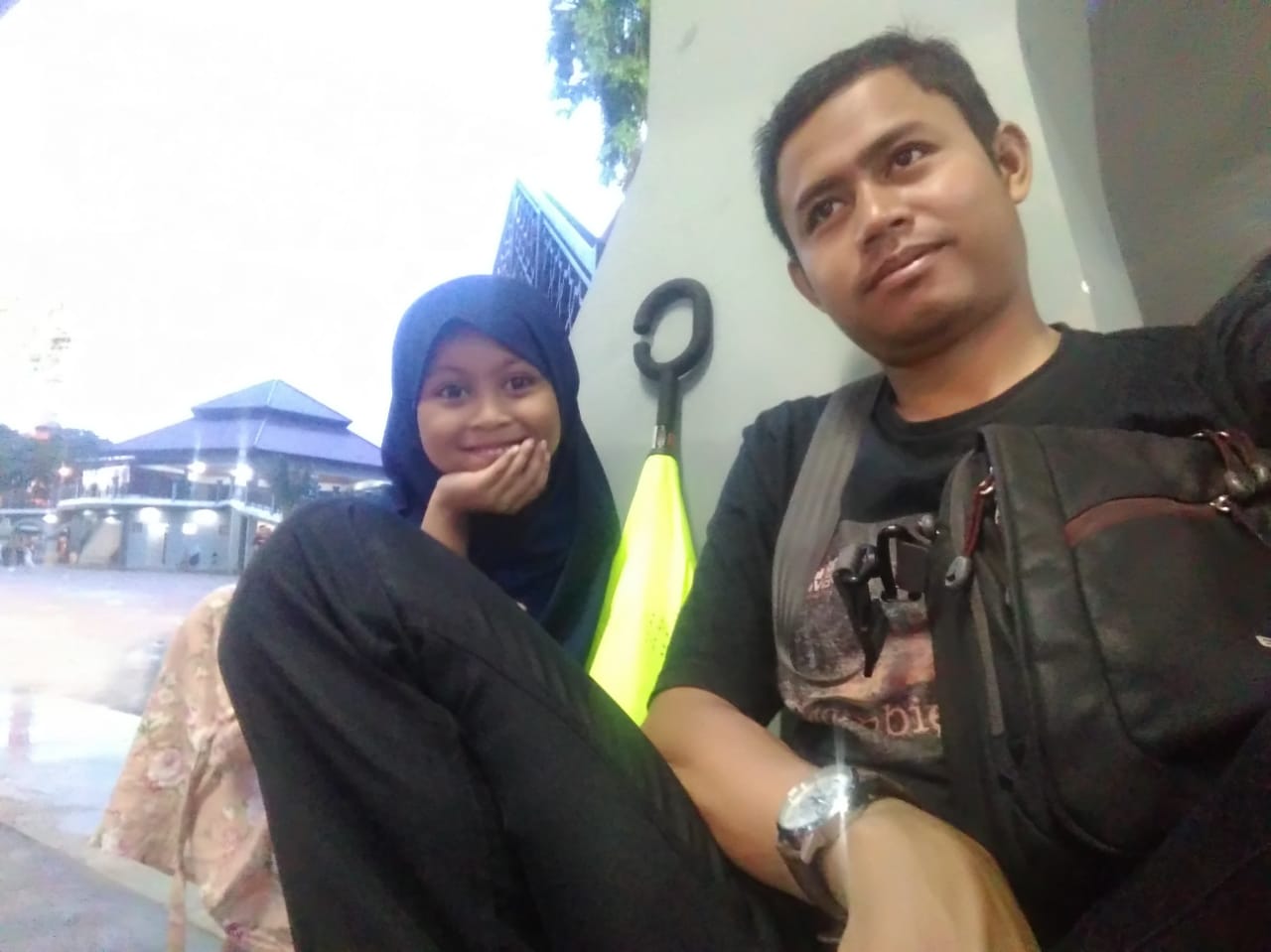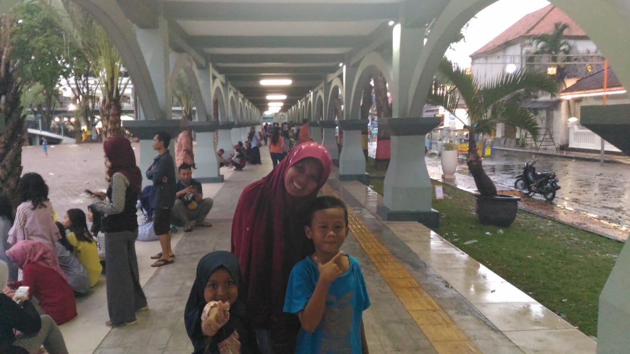 Lalu kami menaiki tangga yang basah dan licin, kata abi jalannya pelan-pelan ya karna lantainya licin dan basah,setelah menaiki tangga yang basah kami melihat-lihat indahnya pemandangan kota Gresik. Setelah melihat-lihat lantai dua kami kembali ke lantai satu dengan hati-hati karna tangganya licin,kami berkeliling lantai satu sambil menunggu hujan yang lebat dan penuh angin,setelah berkeliling lantai satu ,hujan sudah reda,langit pun mulai gelap, adiku ingin makan soto,tetapi aku ingin makan pukis di pinggirnya alun alun. Lalu aku dan adikku bilang ke abiku kalau aku minta pukis dan adikku minta soto lalu abi membelikan pukis yang ku inginkan dan soto yang di inginkan adikku.