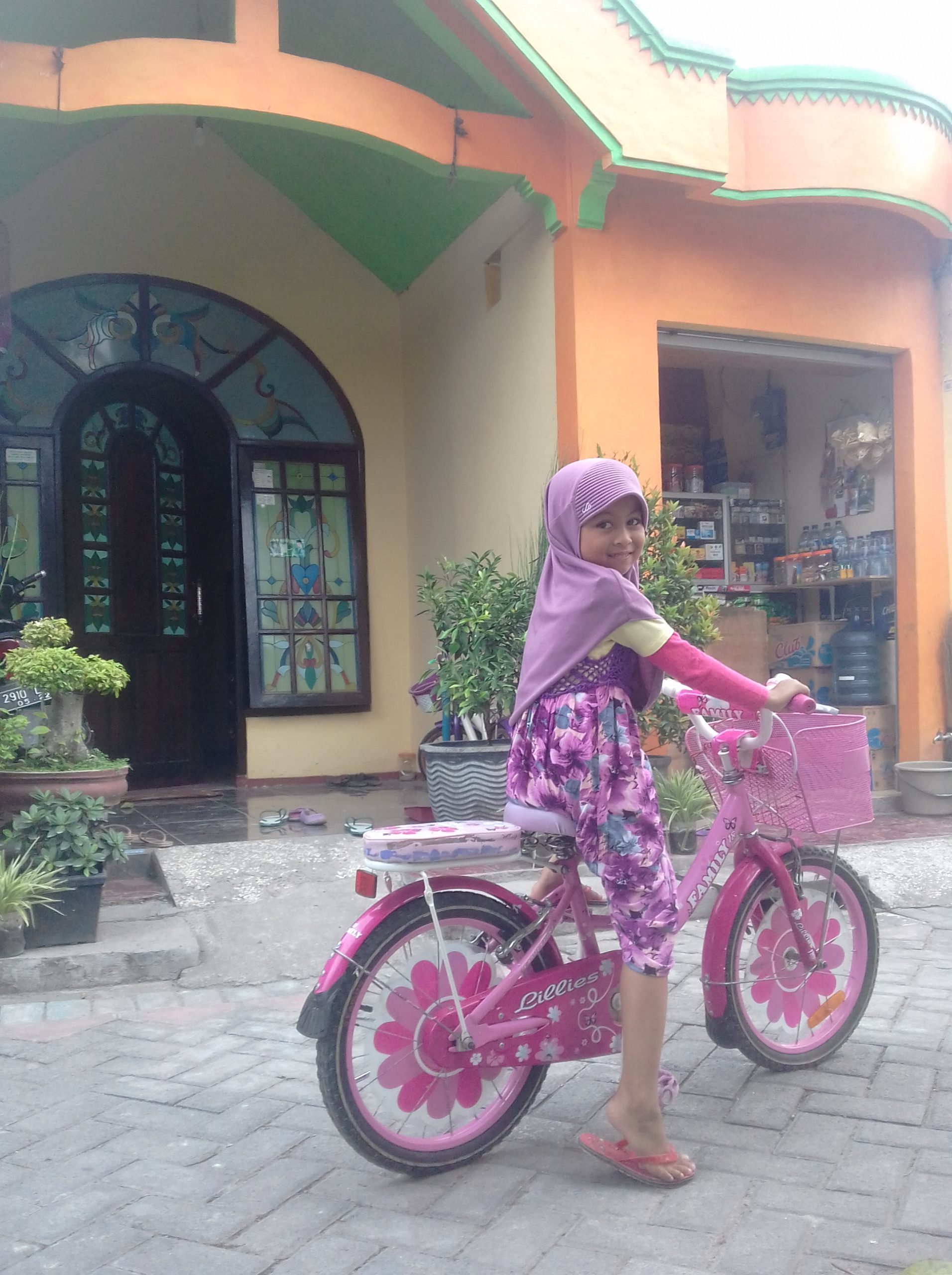 Sebelumnya Dipta sudah pernah belajar bersepeda roda dua. Lalu pernah beberapa kali jatuh. Akhirnya hampir dua bulan tidak mencoba berlatih lagi. Setiap sore hari hanya bisa melihat teman-temannya bersepeda di sepanjang jalan gang kampung. Suatu hari, saya mecoba memotivasi lagi untuk mendampinginya berlatih bersepeda. Alhamdulillah ananda mau mencoba kembali. Pelan-pelan dan berhati-hati Dipta mulai mengayuh sepedanya. Meski belum lancar, akhirnya berhasil menyeimbangkan dan mengendalikan sepeda berwarna merah muda. Mulai dari depan halaman rumah lalu mengitari jalan gang kampung, dengan lancar Dipta berhasil menaiki sepeda roda dua.