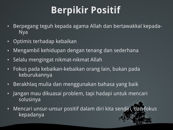 Kawan, mengapa orang mukmin itu sehat jasmani.? Tutur katanya menyentuh hati saat berbicara. Perilakunya menenangkan orang disekitarnya. Hadirnya membawa kenyamanan saat bersama. Tersebab orang mukmin yang sehat tersebut tak hanya sehat jasmaninya, akan tetapi juga sehat ruhaninya. Satu hal kunci sehat ruhaninya yaitu senantiasa berpikir positif. Berpikir positif pada saat kapanpun dan dimanapun. Berikut ini hal-hal apa saja yang akan menjadikan diri kita mampu serta mau berpikir positif: