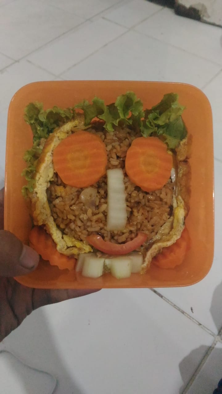 Menarik program ini. Selain memberikan manfaat memupuk kebersamaan melalui kegiatan sarapan, kami pun orangtua termotivasi untuk membuatkan bekal sehat untuk anak. Nah, saya pun berusaha menyiapkan bekal sarapan sehat sesuai request si kakak. Nasi goreng pun menjadi pilihan menunya. Saya yang baru belajar memasak alhamdulillah cukup lama uprek di dapur. Sebelum subuh sudah meracik bumbu nasi gorengnya. Garnis nya pun juga sudah disiapkan.